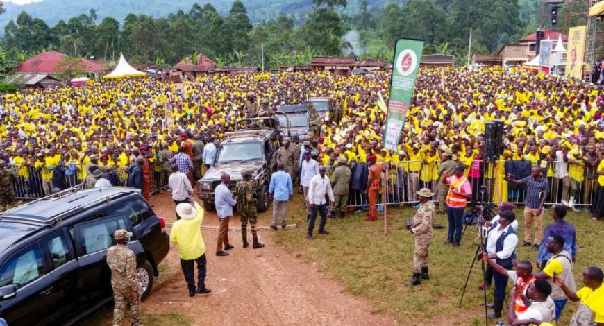 As President Yoweri Kaguta Museveni, Chairman of the National Resistance Movement (NRM), continued his campaign trail across Bugisu Sub-region, the people of Bududa District, through their NRM leadership, warmly welcomed him to the mountainous district with a detailed memorandum highlighting both achievements realized under the NRM government and key development appeals for the area’s continued transformation.