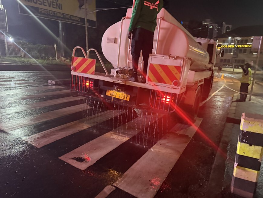 Working through the night, KCCA teams scrubbed and washed major road infrastructure, including the Grand Imperial Roundabout, removing accumulated dirt and debris that had built up from heavy traffic and daily commercial activity.