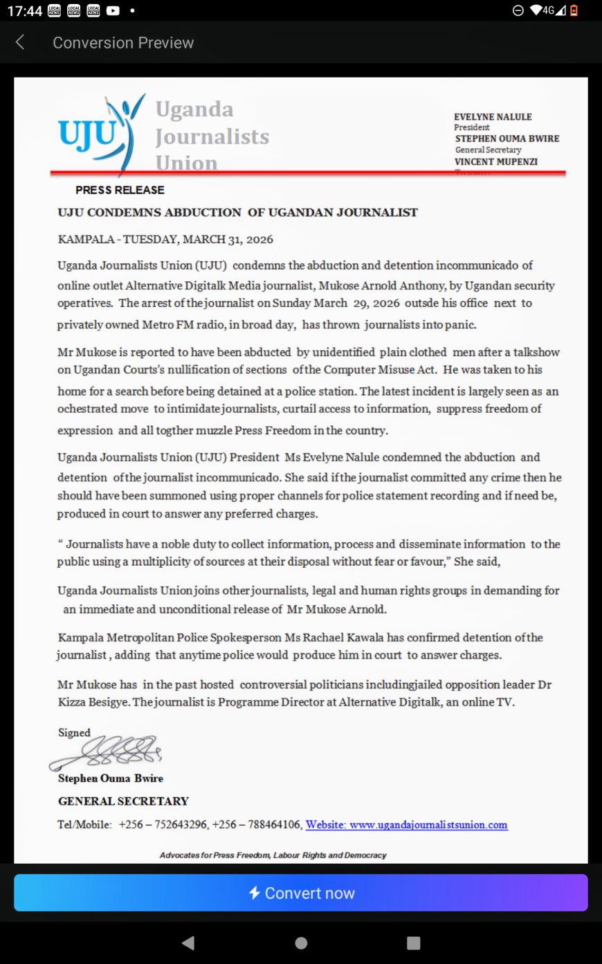 The Uganda Journalists Union (UJU) has strongly condemned the abduction and incommunicado detention of journalist Mukose Arnold Anthony, describing the incident as a grave attack on press freedom and a growing threat to media practitioners in Uganda.