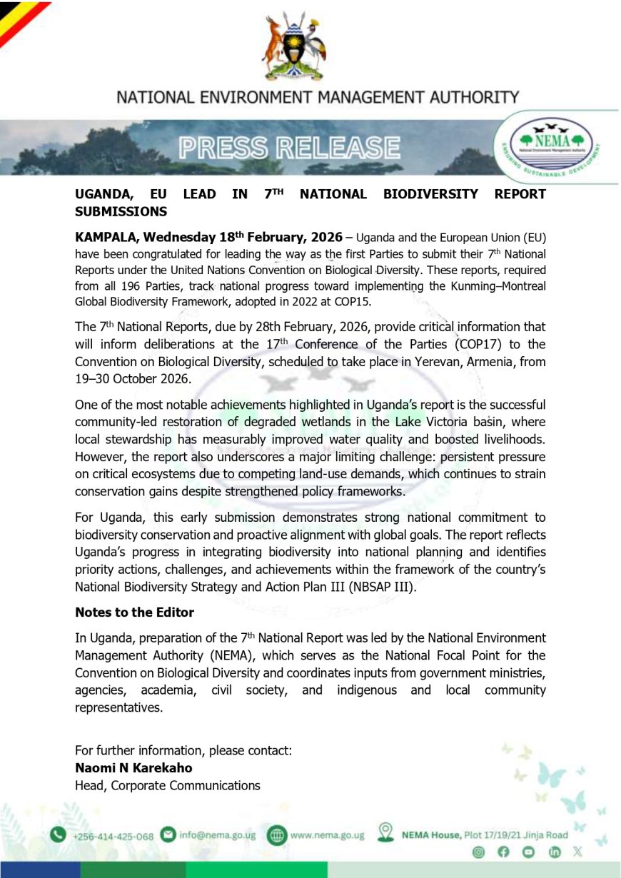 According to a press release issued by National Environment Management Authority, Uganda, alongside the European Union, is among the earliest Parties to complete and submit the report. The submission aligns with global obligations under the Convention, where all member states are required to document national progress toward implementing biodiversity protection frameworks. The 7th National Biodiversity Report is a key accountability and planning instrument tracking how countries are advancing the Kunming–Montreal Global Biodiversity Framework, adopted in 2022.