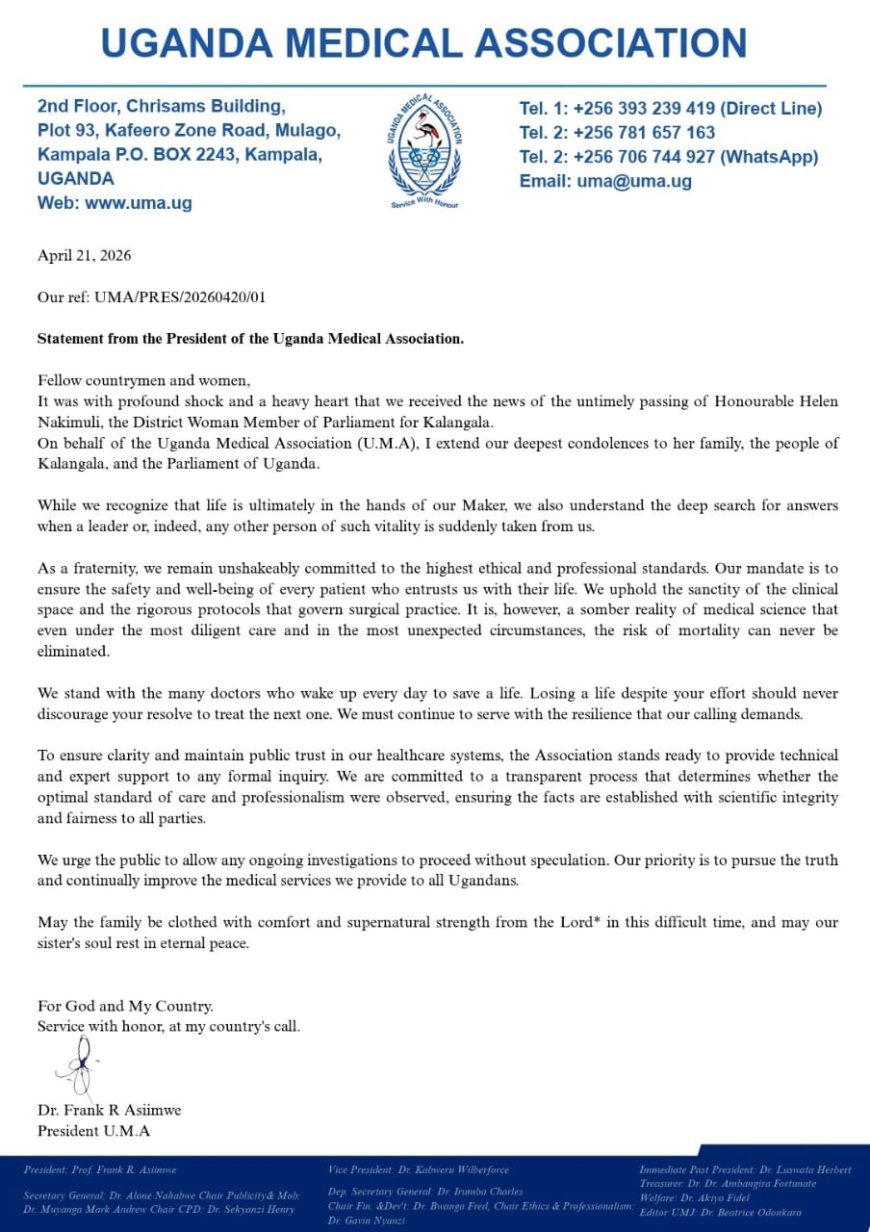 The Uganda Medical Association (UMA) has issued a solemn and carefully worded statement in response to the sudden death of Kalangala District Woman Member of Parliament, Hon. Helen Nakimuli, urging the public to remain calm and allow due medical processes to take their course.